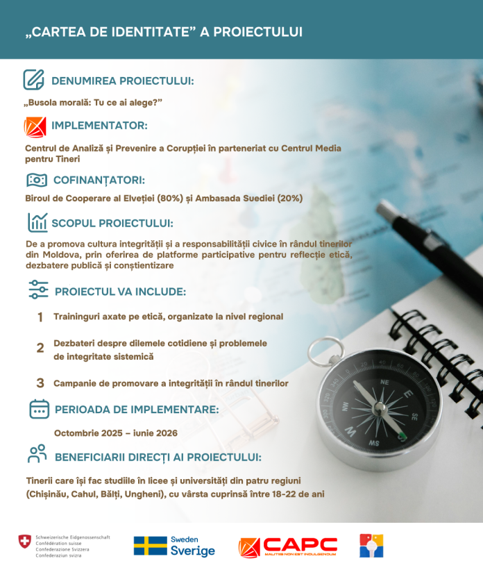 Centrul de Analiză și Prevenire a Corupției (CAPC) anunță lansarea Proiectului „Busola morală: Tu ce ai alege?”, o inițiativă amplă care se va desfășura din octombrie 2025 până în iunie 2026. Proiectul se adresează tinerilor cu vârste între 18 și 22 de ani, încurajându-i să cultive și să promoveze integritatea, să-și asume rolul de cetățeni activi și să ia decizii fundamentate pe valori etice.